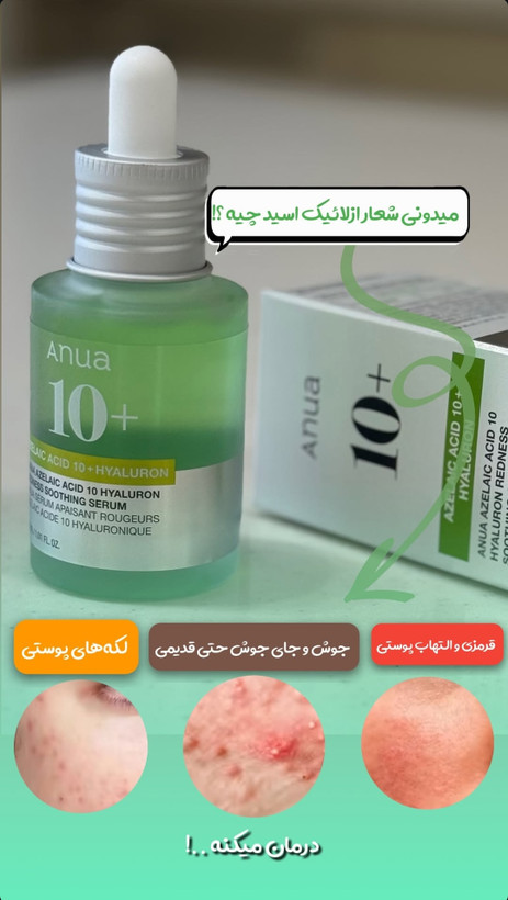 این سرم حاوی سرم آزلائیکاسید آنوا ۱۰٪ است که خاصیت ضدجوش و ضدالتهابی دارد و روی لک های حاصل از ملاسما و جای جوش و هایپرپیگمنتیشن موثره و رنگ پوستوحسابی روشن میکنه😍