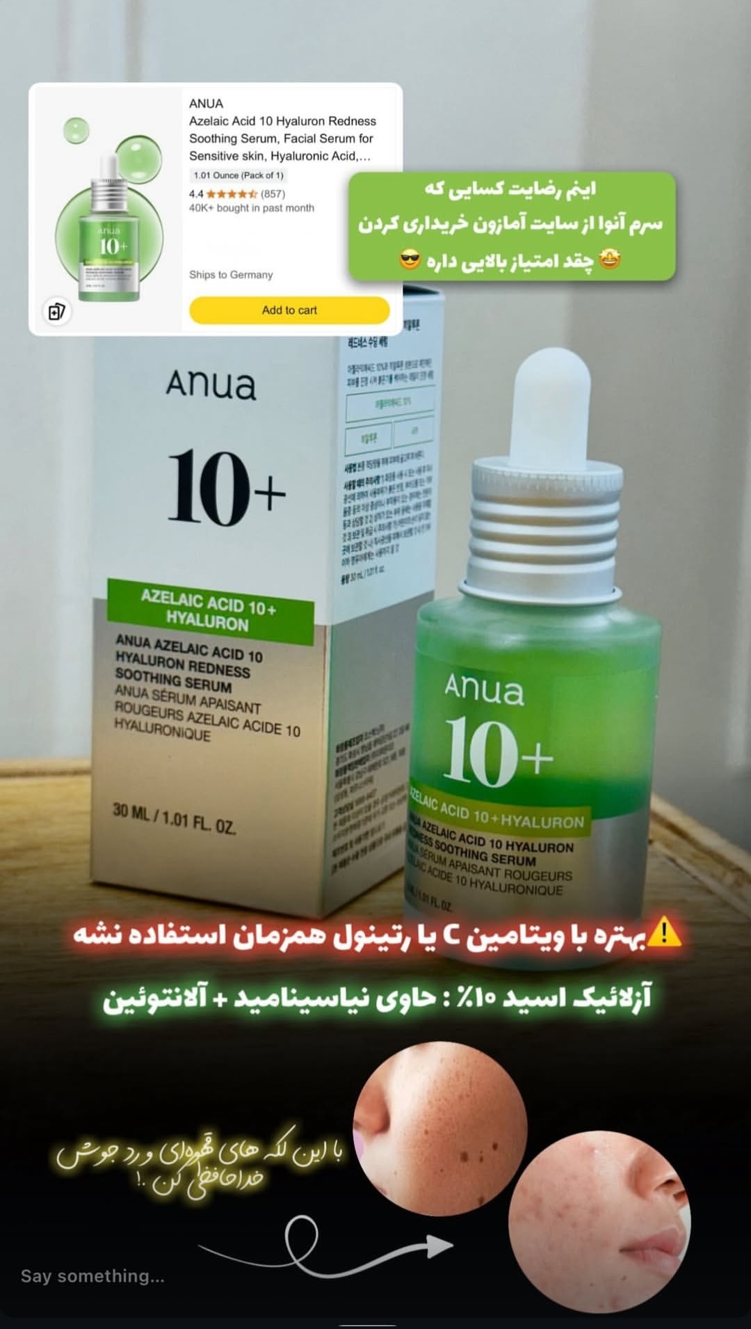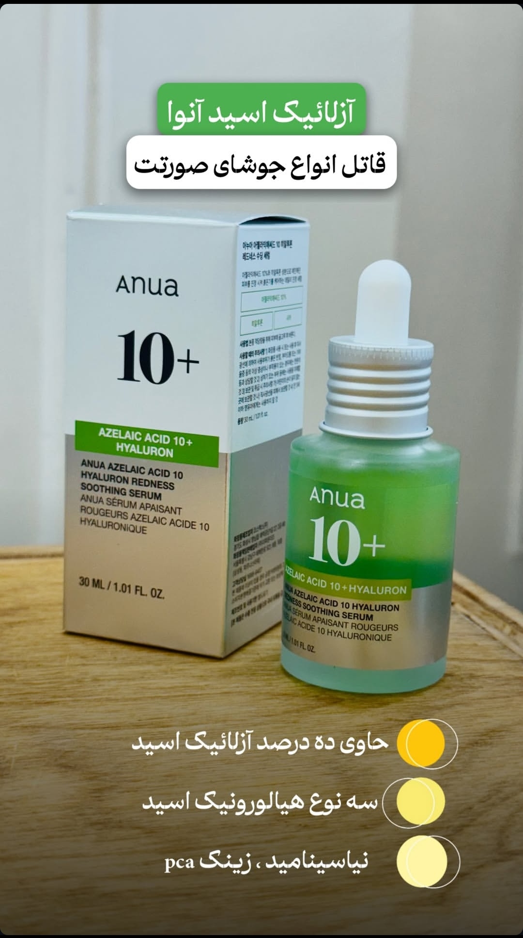 این سرم حاوی سرم آزلائیکاسید آنوا ۱۰٪ است که خاصیت ضدجوش و ضدالتهابی دارد و روی لک های حاصل از ملاسما و جای جوش و هایپرپیگمنتیشن موثره و رنگ پوستوحسابی روشن میکنه😍