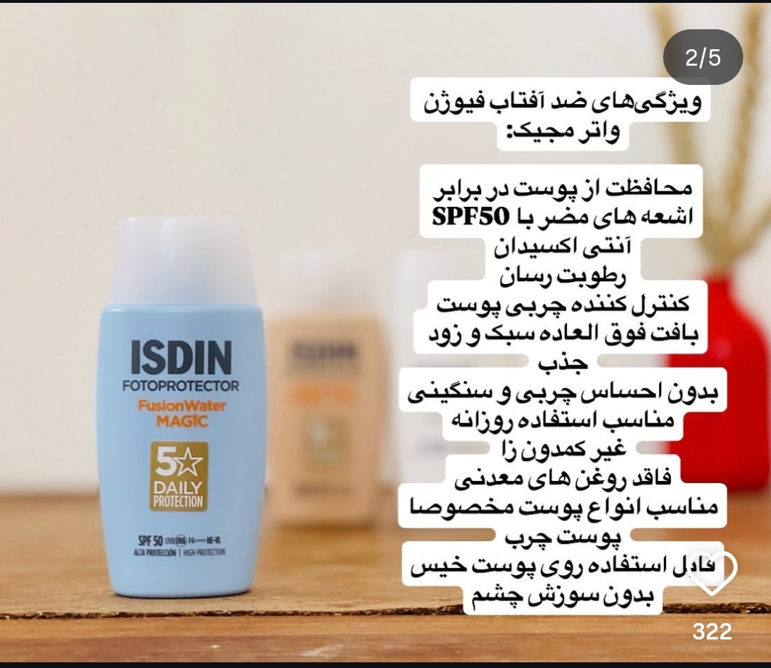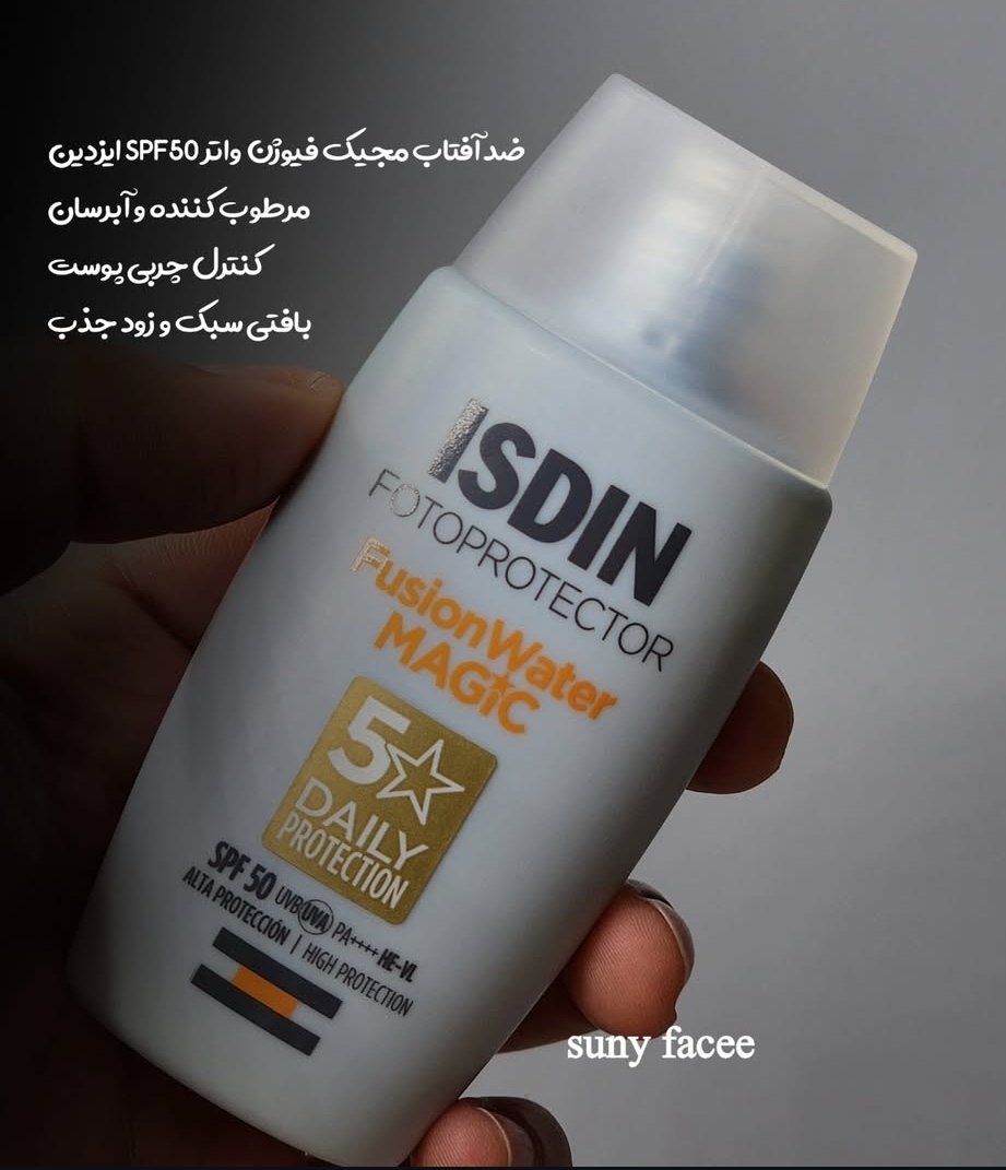 ضدآفتاب فیوژن واتر مجیک ایزدین🌞 بسیار سبک و زودجذب✔️ حفاظت بالا با spf 50 بدون مسدود کردن منافذ( غیر کمدون زا)✔️ حاوی هیالورونیک اسید،ویتامین E و آنتی اکسیدان ها