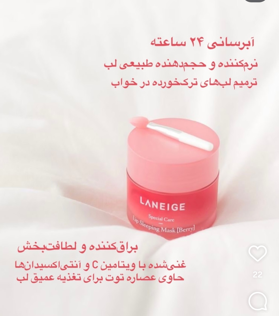 ماسک لب لانیژ توت فرنگی یک ماسک شب فوق العادس که در طول شب رطوبت عمیق را به لبها تزریق کرده و همینطور خشکی و پوسته شدن لبها را کاملا از بین میبرد❤️🔥